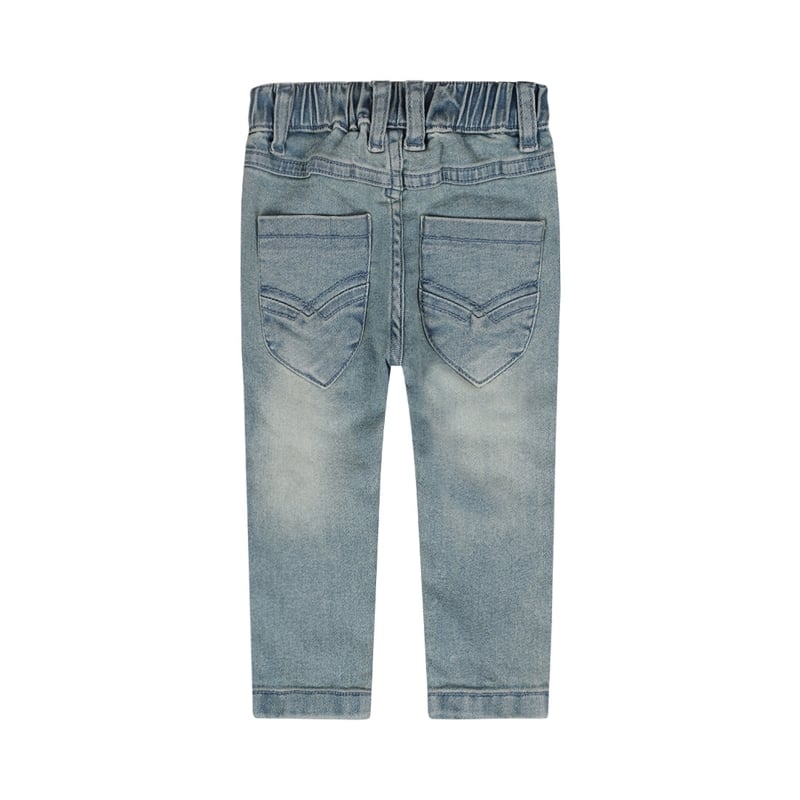 Blauwe jeansbroek met elastiek in de tailleband , knoop en ritssluiting op het voorpand. Twee steekzakken voor en twee zakken op het achterpand.
