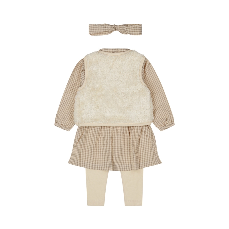 Het babypakje is gemaakt van het jurk: 100% Cotton; legging 95% Cotton/ 5% Elastane; vest: 100% Polyester