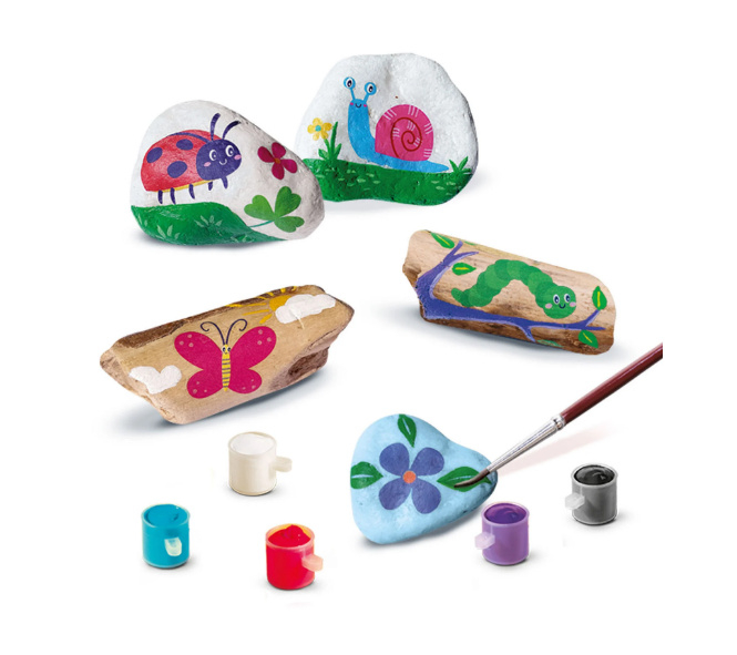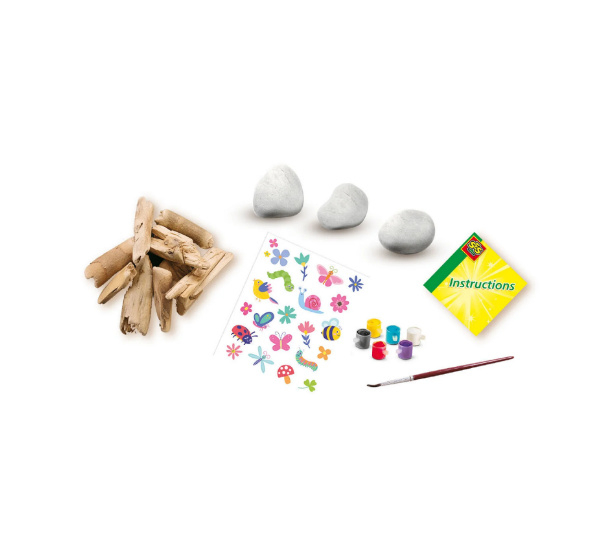 Verschillende kleuren verf en een aantal mooi gevormde stenen en drijfhout die je kunt gaan beschilderen.