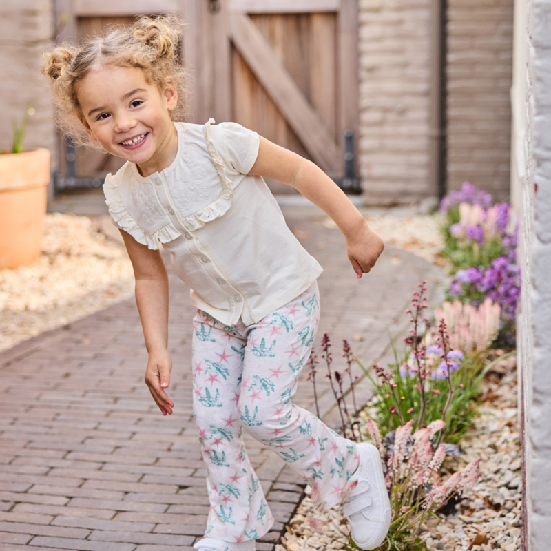 Een zomerse eyecatcher voor de outfit van je meisje! Deze Dirkje flared legging in off white is gemaakt van 100% katoen en draagt daardoor heerlijk luchtig en comfortabel. De meisjes legging met uitlopende pijpjes heeft een speelse all-over print met groene schildpadjes en roze zeesterren en is afgewerkt met uitlopende pijpjes die zorgen voor een trendy look. Perfect te combineren met een T-shirt of top uit de Dirkje collectie.