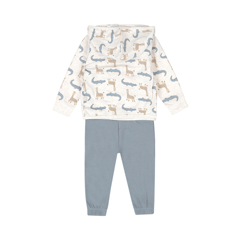 Als het weer wisselt is laagjeskleding ideaal en de Dirkje baby set met vest, shirt en broek past daar perfect bij. Het off white gemêleerde T-shirt heeft een leuke dierenprint en het vest met capuchon maakt de outfit extra stoer, terwijl de blauwe broek van katoen prettig zit. Deze jongens outfit met shirt, vest en broek is voorzien van drukkers op de schouders voor extra gemak.