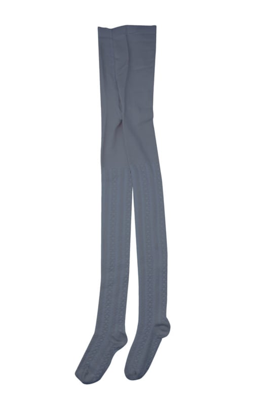 Jeansblauwe maillot in fantasie/kabel patroon gebreid.