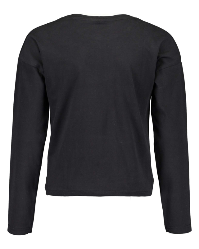 Zwart t-shirt met een ronde hals en lange mouwen. Op het voorpand een print en tekst : "Simplicity is the key ok"" Onderaan het voorpand is de stof geknoopt.