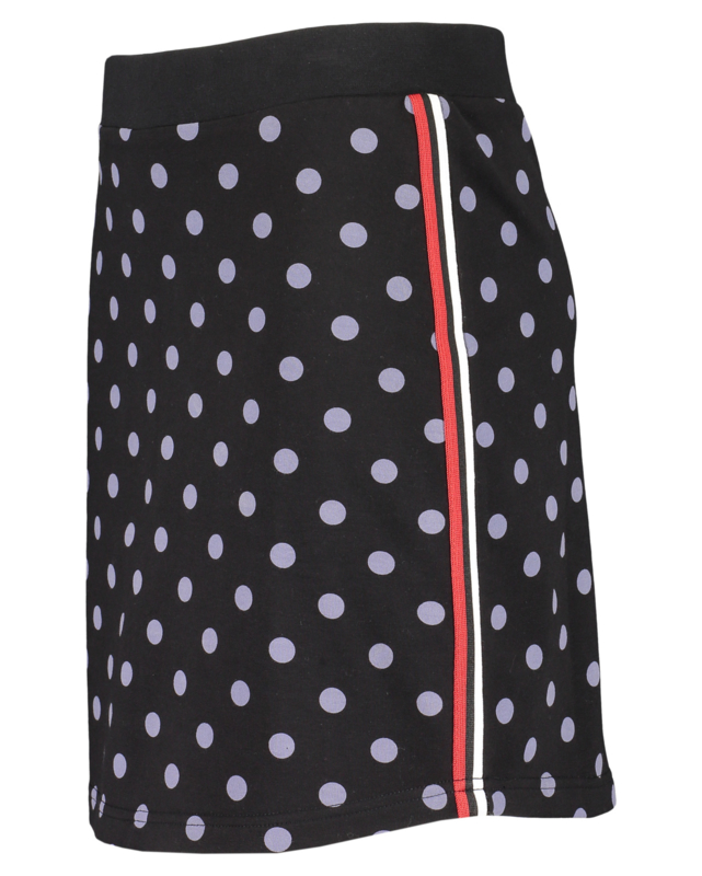 Rok met stippen print, elastiek in de tailleband en op de zijnaden gekleurd band.