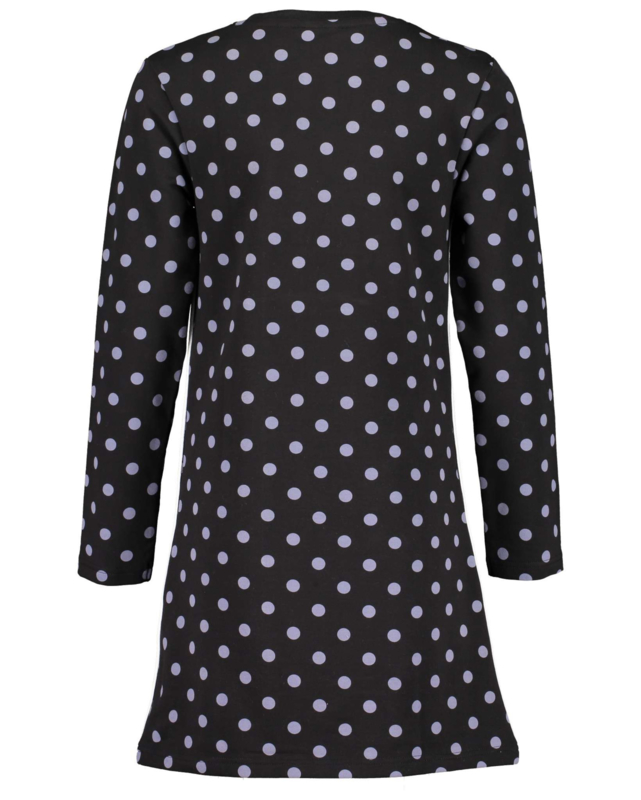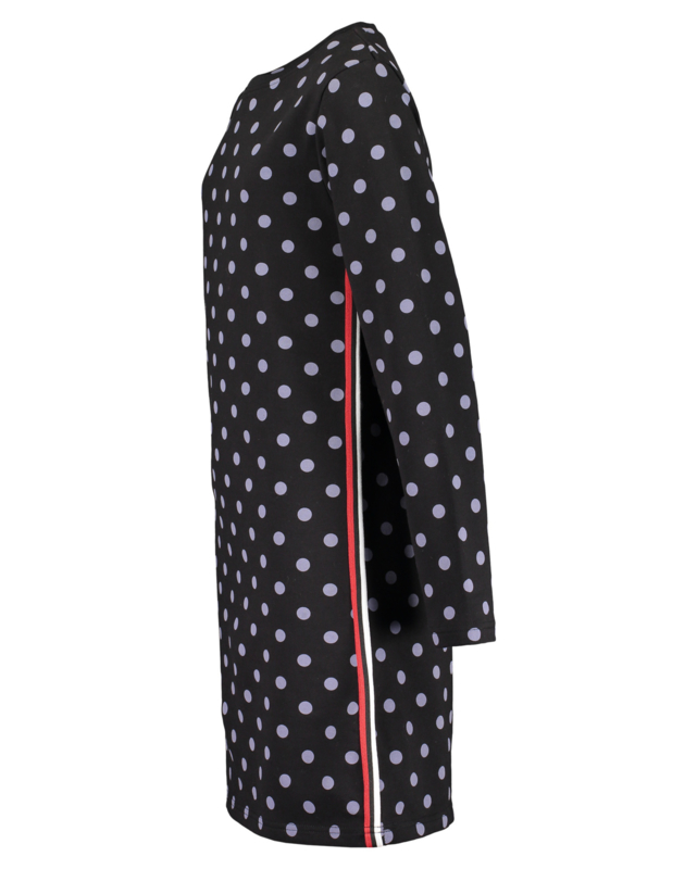 Zwarte jurk met overall print van stippen. Ronde hals en lange mouwen. In de zijnaden een rood-wit gestreept band.