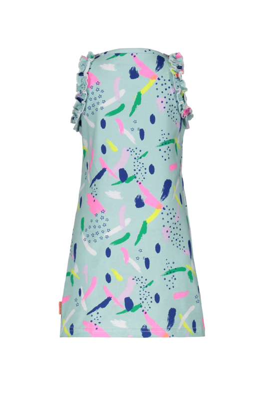 Mouwloos jurkje met allover print, ronde hals en ruches langs de armsgaten. Drukkersluiting op de schouder.