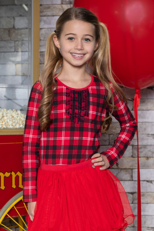 Geruite longsleeve met een rond ehals en lange mouwen. Op het voorpand ruches.