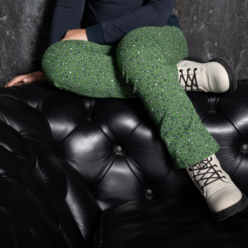 Groene flaire broek met elastiek in de tailleband. Geen zakken in de broek. Mooi om te combineren met de sweater van Lovestation.