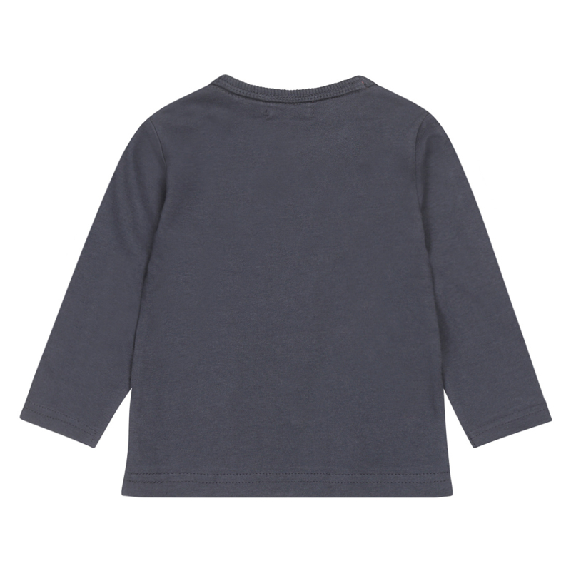 Donker blauw shirt met een rond ehals en lange mouwen. Op de schouder drukker sluiting en op het voorpand een print.