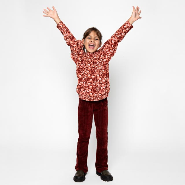 Een meisjes blouse met een ronde hals en een ruche. De blouse heeft een knoopsluiting op het achterpand, lange mouwen met een sierruche op de mouwen en elastiek bij de pols. De meisjes blouse is gemaakt van het materiaal; Shell+lining: 100% Polyester De blouse heeft een was advies: 30 graden en niet in de droger.