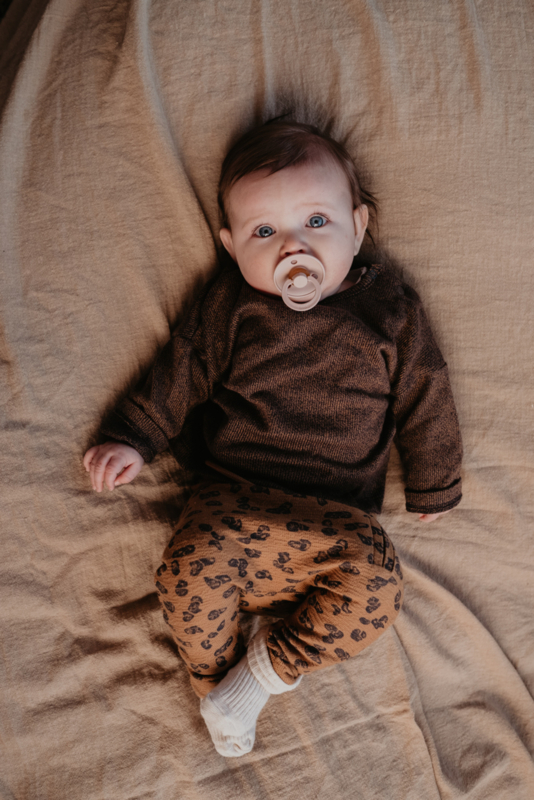 Jongens broek met elastiek in de tailleband en een extra aantrekkoord. Een zak in het voorpand met een ritssluiting. Gemaakt van het materiaal 100% organic katoen. En hetwas advies: 30 graden normaal programma, niet in de droger.