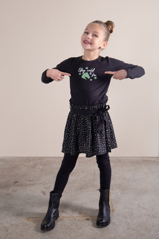 Zwart jurkje met een ronde hals en lange mouwen. De rok heeft groene stippen en op het voorpand de tekst Stay wild & free met een paardenhoofd.