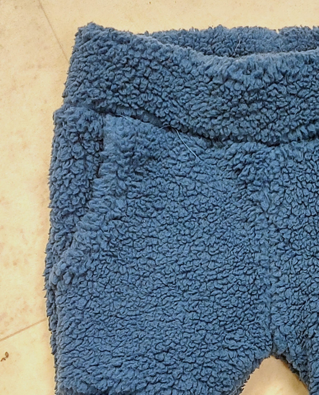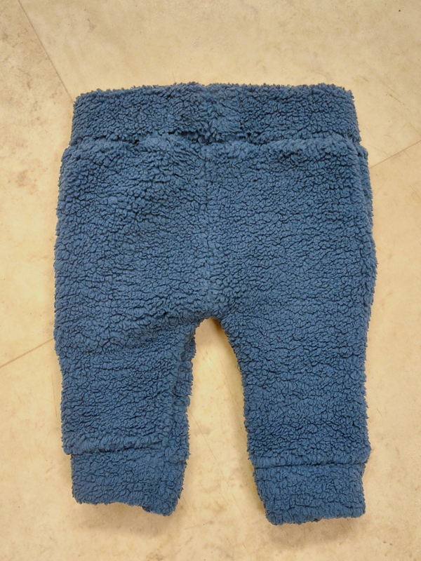 Een zachte blauwe jongens broek met elastiek in de tailleband en twee steekzakjes in het voorpand.