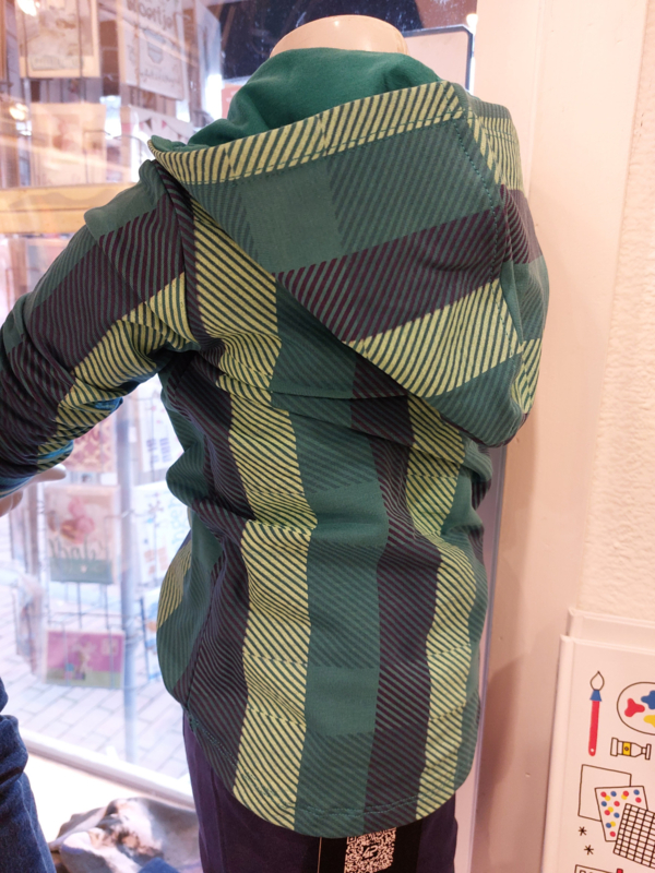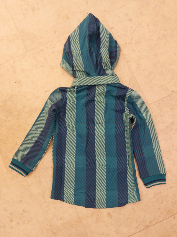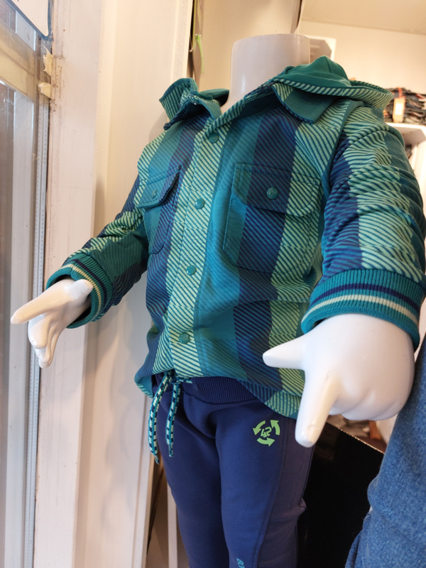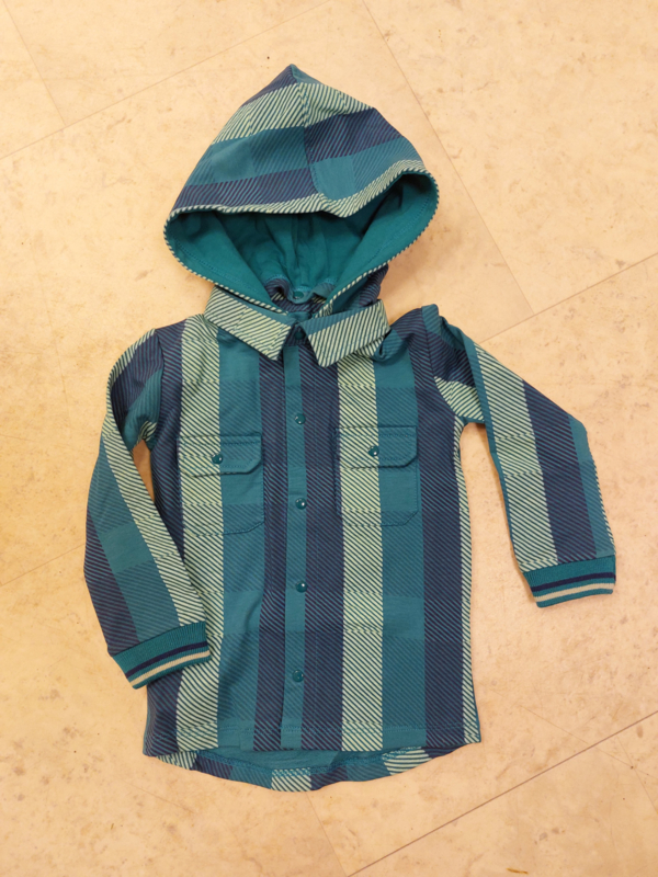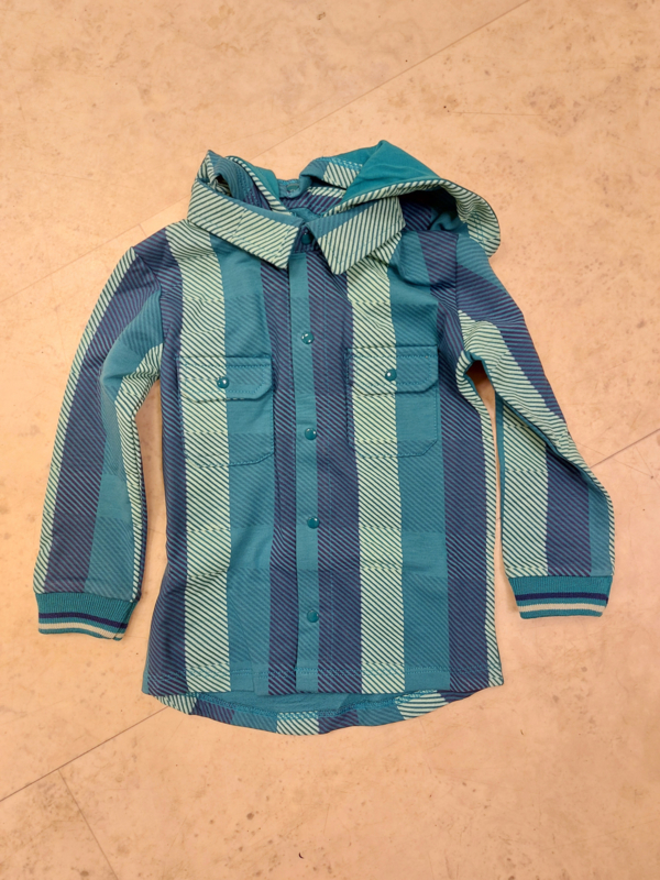 Een blauwe overhemd met een klassieke kraag en capuchion, lange mouwen , drukkersluiting op het voorpand.Twee borstzakken op het voorpand.